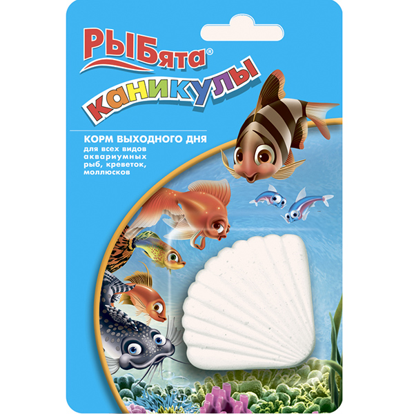 Почему так удобен корм "РЫБята каникулы"? Корм в гипсовой ракушке обеспечит бесперебойное питание аквариумных рыбок, а также креветок и моллюсков в твое отсутствие. В корме содержатся все жизненно необходимые питательные вещества. Корм высвобождается из растворяющейся ракушки постепенно, поэтому приблизительно в течение двух недель обитатели аквариума не останутся голодными. Скорость растворения зависит от жесткости воды и интенсивности ее перемешивания.