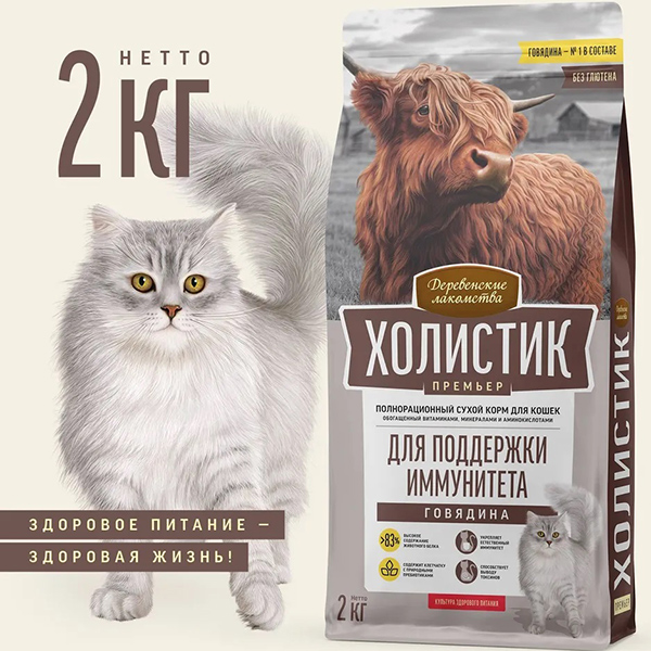 Деревенские лакомства Холистик Премьер сух.корм д/кош.д/иммунитета 2кг говядина АКЦИЯ -20%