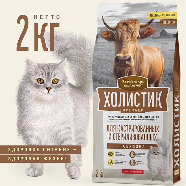 Деревенские лакомства Холистик Премьер сух.корм д/кош.кастр.и стерил.2кг говядина АКЦИЯ -20%