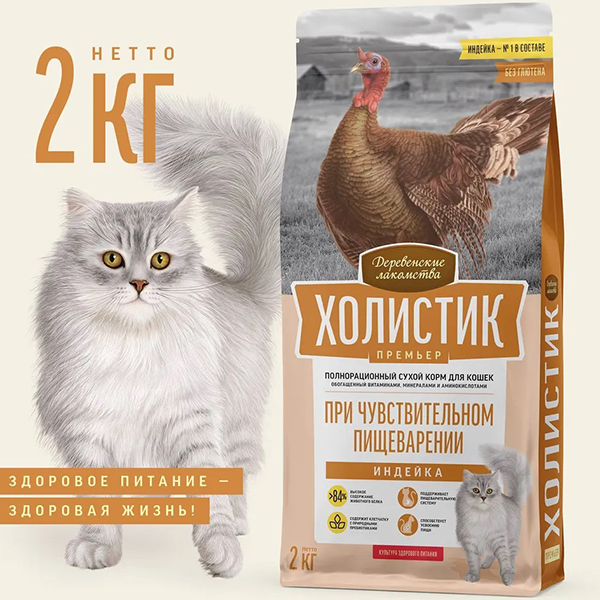 Деревенские лакомства Холистик Премьер сух.корм д/кош.с чувств.пищевар.2кг индейка АКЦИЯ -20%