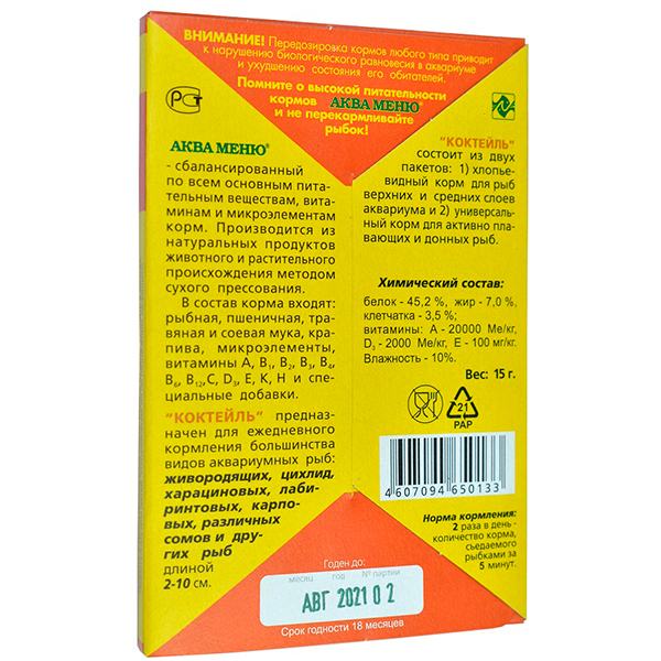 «КОКТЕЙЛЬ» — ежедневный корм для аквариумных рыб мелких и средних размеров (2 — 10 см): живородящих, цихлид, харациновых, лабиринтовых, карповых, различных сомов и др. «Коктейль» состоит из двух пакетов: