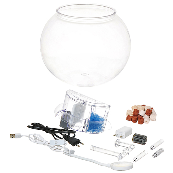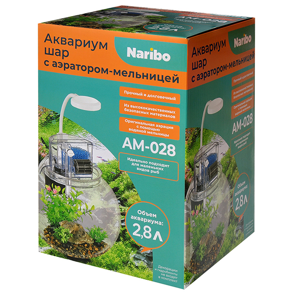 Аквариумный набор Naribo с оригинальным аэратором. В набор входит: аквариум-шар (пластиковый) объемом 2.8л, фильтр 4Вт, наполнители для фильтра (губка и керамические кольца) и светильник, работающий от USB адаптера, а также аэратор-мельница. Аквариум, изготовлен из высококачественного пластика. Производительность фильтра 300л/ч. Мощность светильника 3Вт. Данный набор идеально подходит для маленьких видов рыб. Вес: 0,69 кг. Упаковка: по 1 шт