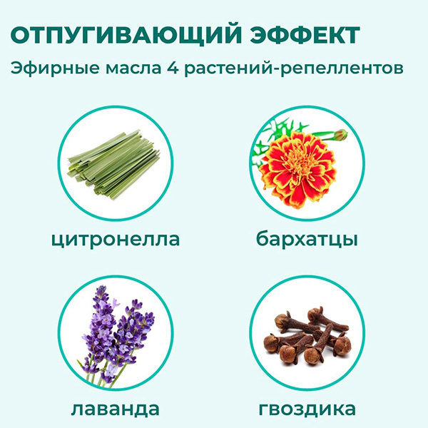 Запах растений, входящих в состав, эффективно отпугивает насекомых.