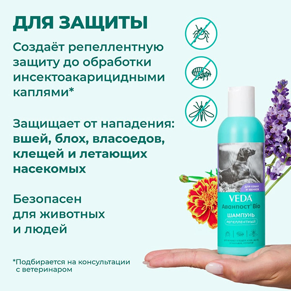 Шампунь репеллентный Аванпост Bio — бережный уход и защита от насекомых. Это современное многофункциональное средство зоогигиены, основанное на уникальном активном комплексе натуральных эфирных масел — собственной разработке компании «ВЕДА».