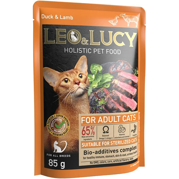 LEO&LUCY холистик влаж. д/кош.85г Кусочки в соусе с уткой, ягн и биодоб, подх стер СРОК РЕАЛ 10.26