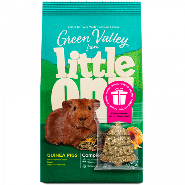 Лакомство в подарок при покупке корма! Little One «Зеленая долина». Корм из разнотравья для морских свинок - корм для декоративных животных, в состав которого входит 60 разновидностей трав. Изготовленный с помощью специальной технологии холодного прессования, корм сохранил все витамины, минералы и другие ценные питательные вещества, входящие в состав растений. Корм богат длинными волокнами клетчатки, что обеспечит необходимый уход за зубами и правильное пищеварение у свинок. Рацион обогащен фруктоолигосахаридами — натуральными пребиотиками, которые поддержат рост полезной микрофлоры в кишечнике. Жирные кислоты ω-3 и ω-6, содержащиеся в корме, обеспечат здоровье кожи и сделают шерсть питомца густой и блестящей. Дрожжевой экстракт, богатый витаминами группы В, селеном и β-глюканами, окажет благотворное влияние на иммунную систему. Для разнообразия рациона морской свинки в состав корма входят вкусные и полезные добавки — сушеные цветы, фрукты, овощи и ягоды. Не содержит зерновых компонентов, что прекрасно подходит для диетического питания животных, в том числе страдающих от избыточного веса и других заболеваний. Не содержит красителей, ароматизаторов, ГМО. Ингридиенты: Луговые и горные травы Яблочные выжимки Мука из семян подсолнечника Семя льна Льняное масло Фруктоолигосахариды Сушеная тыква Сушеный пастернак Сушеное яблоко Цветы календулы Шиповник Сушеный цуккини Цветы василька Лепестки розы Дрожжевой экстракт Экстракт юкки Пищевая ценность Белки — 13,5% Жиры — 3,5% Клетчатка — 24% Зола — 6% Кальций — 0,6% Фосфор — 0,4% Питательные добавки/кг Витамин А — 9393 МЕ Витамин D3 — 750 МЕ Витамин Е — 94 МЕ Витамин С — 465 мг Биотин — 620 мкг Йод — 1,4 мг Сульфат меди (II) — 0,03 мг Селенит натрия — 0,06 мг