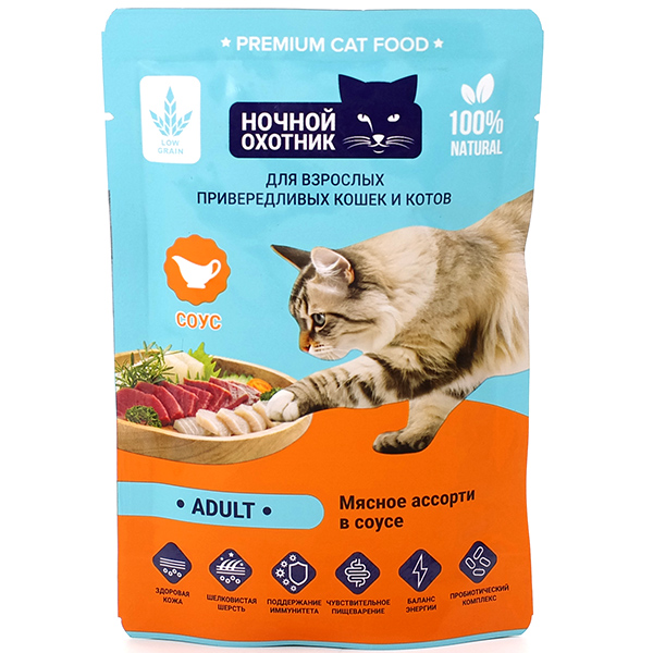 Ночной охотник ADULT влаж д/кошек и котов привередл. 85гр кусочки в соусе Мясное ассорти