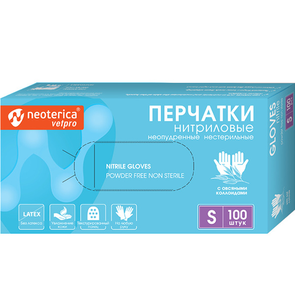 Перчатки нитриловые неопудренные нестерильные с овсяными коллоидами (S)д/осм.жив,однор.срок до 04.26