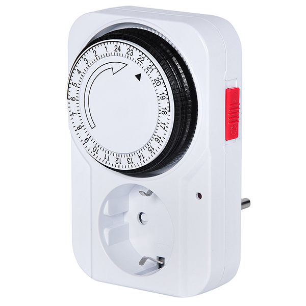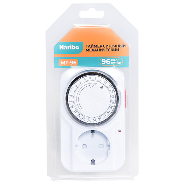 Механический суточный таймер Naribo. 96 вкл/выкл в сутки. Минимальный интервал включения 15 мин. Степень защиты IP20. Номинальное напряжение 230В, номинальная частота 50Гц, номинальный ток 16А. Возможность выбора режимы работы с программируемого на постоянное включение нагрузки с помощью переключателя. Вес: 0,134 кг. Упаковка: по 1 шт