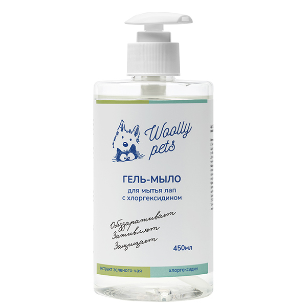 Гель-мыло для мытья лап с хлоргексидином. Комплекс мягких моющих компонентов бережно очищает шерсть и кожу питомца, оставляя приятный аромат.